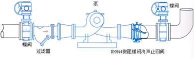四、法蘭微阻緩閉消聲旋啟式止回閥典型安裝示意圖:
